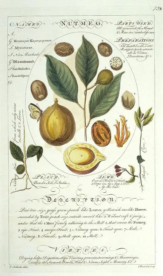 《Botanicum Medicinale》一书中的肉豆蔻插图,1759年,Timothy Sheldrake,藏于伦敦自然历史博物馆以最大宗的胡椒为例:15世纪,60克胡椒的价格是38杜卡特,约合现在5320美金;那时,达·芬奇一年的年薪是400杜卡特。