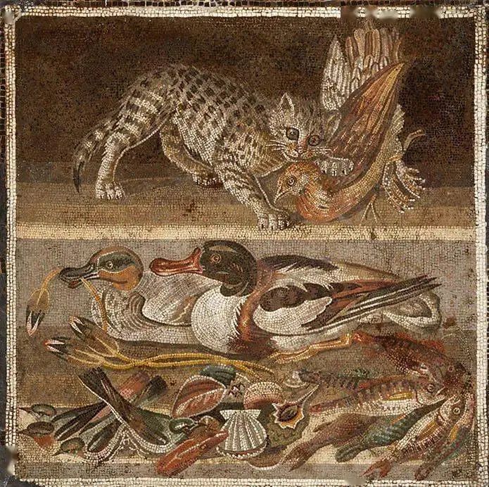 农牧神之家的地板镶嵌画,庞贝,藏于那不勒斯考古博物馆或者如同马库斯·卢克莱修斯·弗朗托之家,那绘有生动鱼鲜、好似能从墙上跳出来的家谱室墙壁,以祈祷家族持续丰饶,岁岁有余。