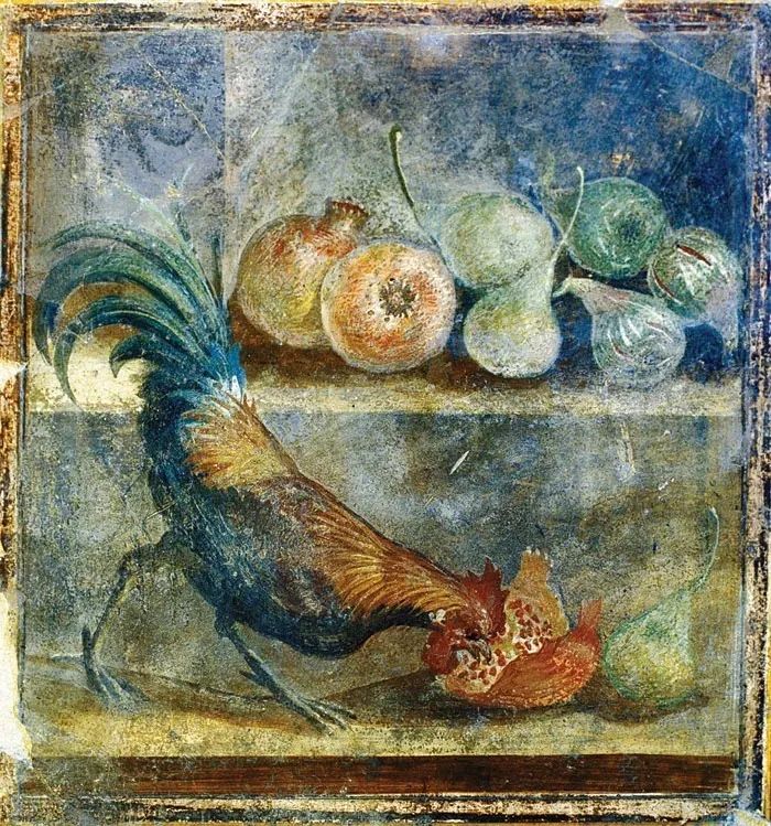 《啄食石榴的公鸡》公元45-79年,切斯特情人之家-庞贝画中的石榴、梨、无花果将出现在晚餐的餐桌上