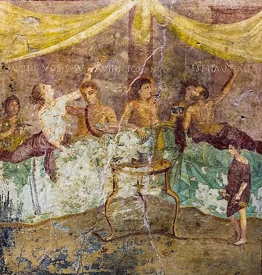 宴会场景,庞贝而对贵族来说,晚餐则是身份和财力的象征,是不着痕迹炫耀品味的时刻。或是有时髦的躺卧餐厅和精美的银质餐具。