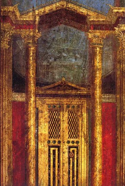 庞贝第二风格,来自神秘别墅的卧室壁画装饰完美融入空间的实际几何构造中,仿佛可以穿过这扇门去往建筑的他处。