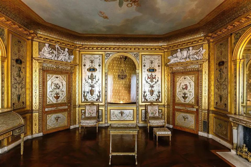 枫丹白露宫-玛丽·安托瓦内特的客厅,墙面纹样都有明显的庞贝第四风格而路易十六风格的室内装饰与家具标志着新古典主义的胜利。