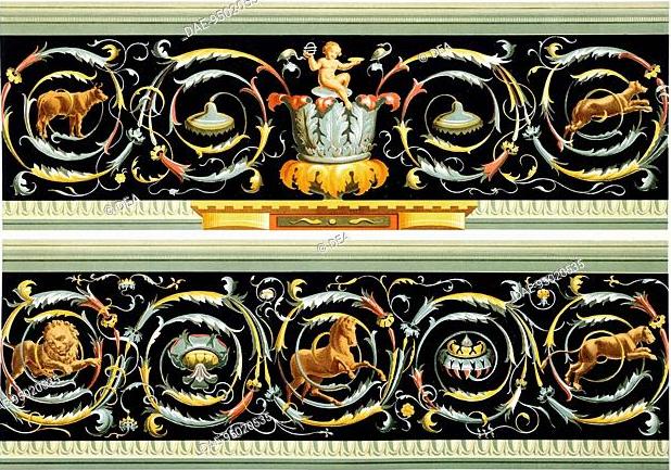 边柜上的卷草纹样同样参考自庞贝壁画(上图),来自伊西丝神殿柱廊,藏于那不勒斯国家考古博物馆刚硬的线条和对称的造型,旨在煊赫君权的威严、不可侵犯。