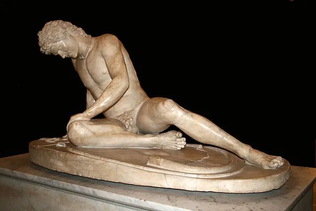 《垂死的高卢人》,大理石雕像,藏于卡比托利欧博物馆庞贝遗迹中,凯基利乌斯·尤昆图斯之家中的主人雕像,不仅保留了他的招风耳、鹰钩鼻,连下巴上的瘊子都一比一还原。