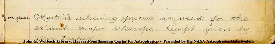 PHAEDRA项目整理出来的笔记本中关于安娜献出望远镜镀银工艺的记录。图片来源:Wolbach library, CfA