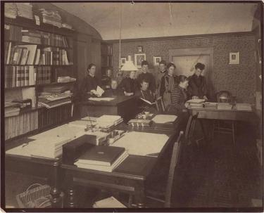 弗莱明(最右站立者)向安娜(右起第二,坐在桌子前)展示德雷珀星表的进展,图中其他人都是哈佛女计算员。│图源:Center for Astrophysics/Harvard & Smithsonian