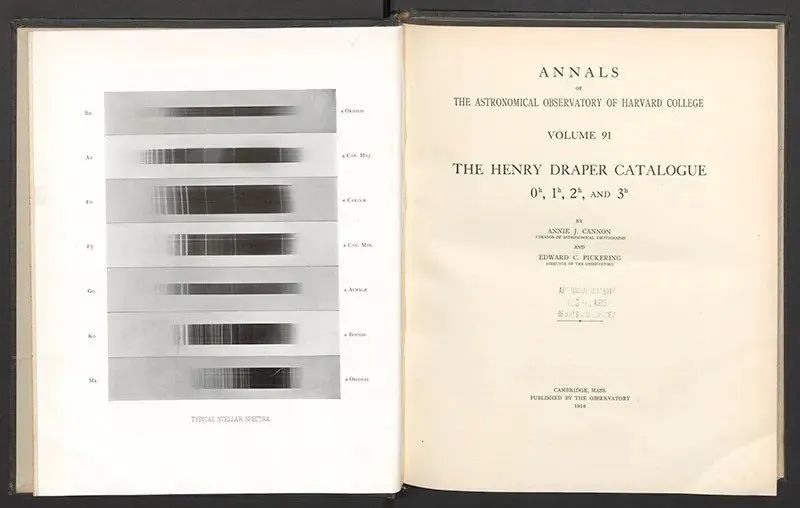 德雷珀星表第一卷的卷首插图与扉页。插图给出了由哈佛大学女计算员坎农等人确定的恒星的7类典型光谱:O、B、A、F、G、K与M。│图源:Annals of the Astronomical Observatory of Harvard College, volume 91, 1918 (Linda Hall Library)
