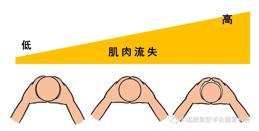 肌肉减少10%,机体免疫功能下降,感染风险增加;肌肉减少20%,虚弱无力,日常生活能力下降,伤口愈合延迟,感染;肌肉减少30%,独立坐起困难,易发生压疮,还可致残;肌肉减少40%,死亡风险明显增加,如死于肺炎。