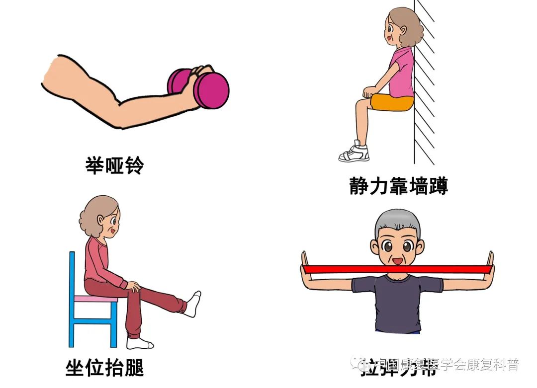①抗阻运动(如拉弹力带、举哑铃或矿泉水瓶等)是运动干预的基础和核心部分,以渐进式增加运动强度为特点,通过增加I型和II型肌纤维的横截面积,增强全身肌肉质量,提高身体机能和步速。