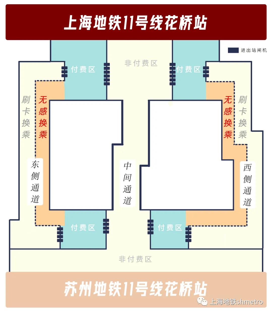 而选择刷卡换乘通道(检票通道),乘客到达11号线花桥站后,需要刷卡出闸,按照换乘指引,通过刷卡换乘通道(检票通道),再次刷卡进入苏州地铁11号线,但无须二次安检。