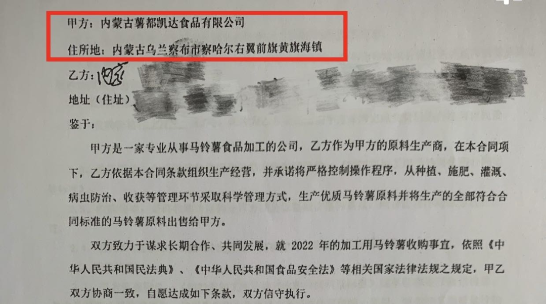 事情的起因全源于权贵那一点“小心思”。海瑞的父亲权贵(化名)原本是乌兰察布市察哈尔右翼中旗一名普普通通的农民,一直以种土豆为生。2022年4月12日,正值春耕,权贵与内蒙古薯都裕农种业科技有限公司(以下简称薯都裕农)和内蒙古薯都凯达食品有限公司(以下简称薯都凯达)分别签订了农资购买合同和马铃薯收购合同。