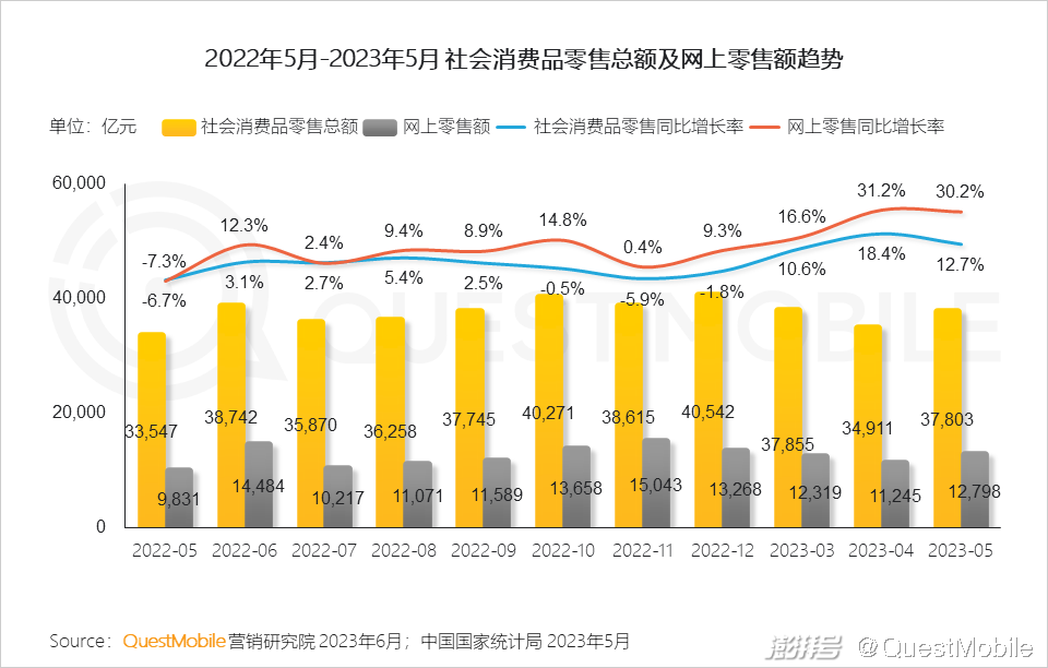 1.1 2023年上半年社会消费品零售总额持续增长,线上消费增长更为突出