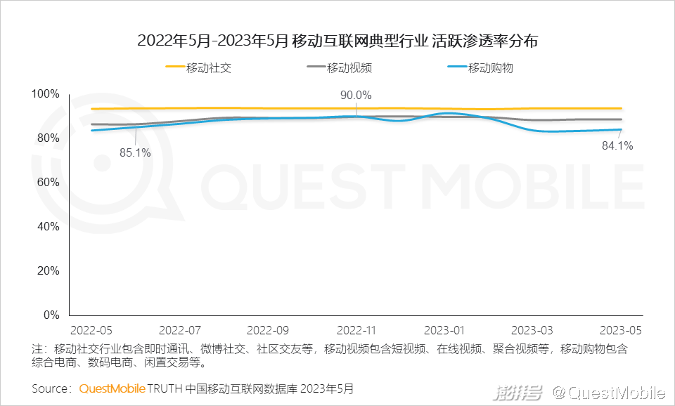 根据QuestMobile中国移动互联网数据库显示,2022年6月移动购物行业活跃渗透率为85.1%,到2022年11月达到90.0%,仅次于移动社交行业。