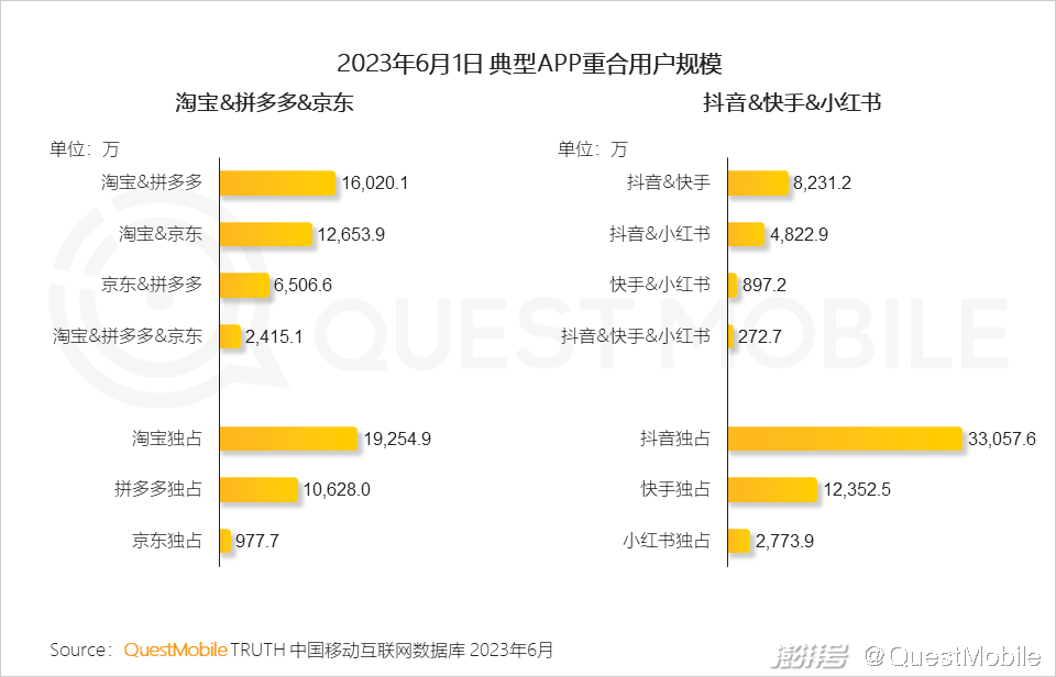 由此,各平台和品牌商上演了一出出“合纵连横”的大戏:淘宝和拼多多重合用户规模1.6亿,淘宝和京东重合用户规模1.27亿,京东和拼多多重合用户0.65亿;抖音快手重合用户0.82亿,抖音小红书重合用户0.48亿,快手小红书重合用户897万……