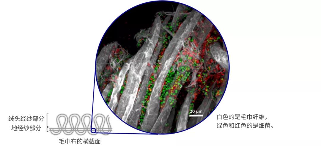 毛巾纤维里,绿色是活的细菌,红色是死了的细菌。