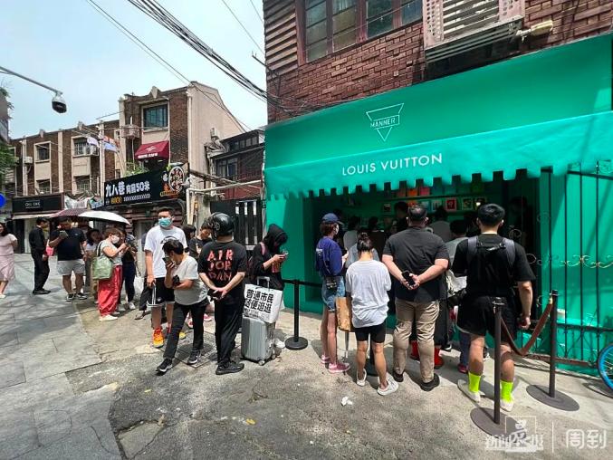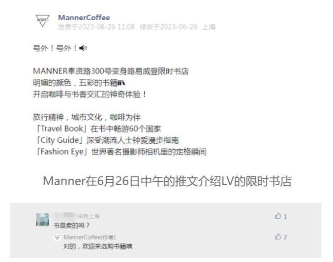 6月25日下午,位于奉贤路的Manner咖啡馆门口排起了长队一些买到了LV咖啡的白领第一件事情就是赶紧拍照打卡。一位背着红色帆布袋的女生刚刚从永嘉路的LV书店赶来,头上还有汗水。这位看上去非常懂经的女生告诉记者,购买的书籍只要没有拆封过,是可以去LV专卖店调换同价位的书的。