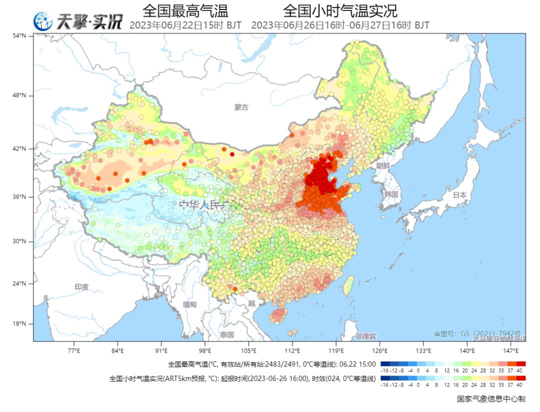 上图是中央气象台6月27日发布的最高气温24小时预报,下图是国家气象信息中心6月22日也就是端午节那天全国最高气温实况图。两者可以说是很形似了。