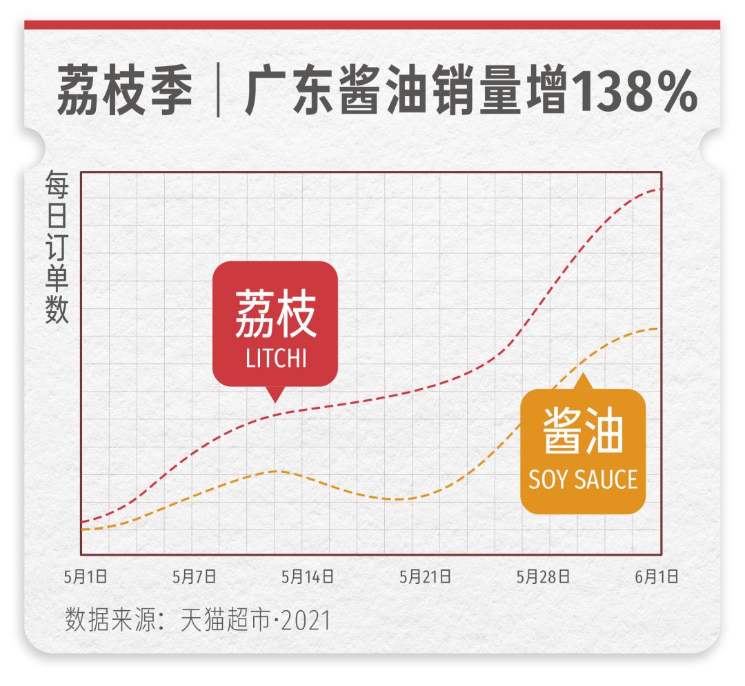 有个巧合又有趣的现象 : 据天猫超市数据,2021年5月1日—6月1日,荔枝热销的同时,广东地区酱油销量也开始增长。
