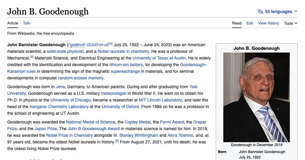 新能源赛道,锂电池之父古迪纳夫:本科学文学,博士转物理, 54 岁开始研究锂电池, 97 岁获诺奖