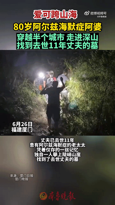 近日,福建厦门,患阿尔茨海默症的李奶奶独自出门走失,救援人员最终在一处陡峭山崖找到老人,她已有些虚脱。原来,李奶奶独自沿着崖边小路,走到了丈夫墓地,这条路她仅在老伴下葬时走过一次…李奶奶被找到后送到医院进一步检查,祝李奶奶身体健康!