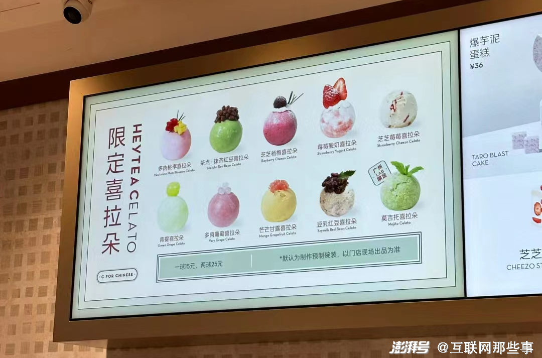 喜茶也在Lab门店中引入gelato,并继续延用“喜”字辈的户口,意外的是其定价偏低,共有10个口味,产品名也多延用了饮品名,诸如多肉桃李,芝芝杨梅,芒芒甘露等。