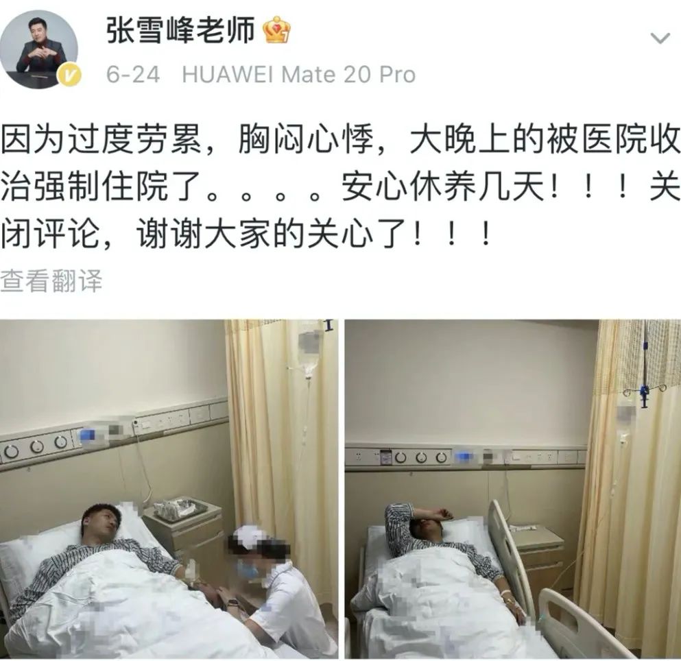 6月24日,张雪峰发微博称,因过度劳累、胸闷心悸,被医院收治强制住院,将关闭评论,安心修养几天。