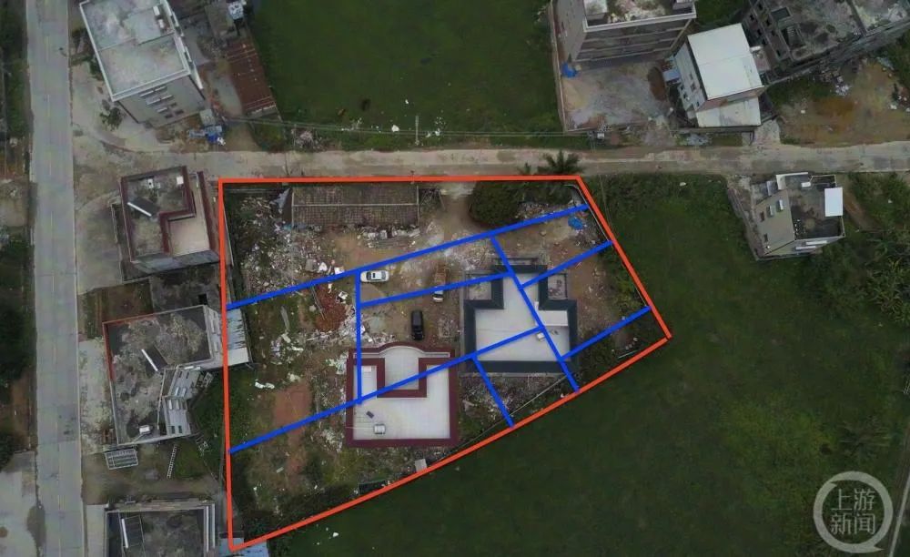 两栋新建的楼房位于普宁市高埔镇下车巷路口,所占土地归属龙堀村和高车村两个村。两楼外墙颜色相近,一栋屋顶为蓝黑色房檐,另一栋是红色房檐。红色房檐楼房建于2018年,占地165平方米,户主为龙堀村村民朱某果;蓝黑色房檐楼房动工于2020年,占地206平方米,户主为高车村村民朱某其,朱某果和朱某其是堂兄弟关系。
