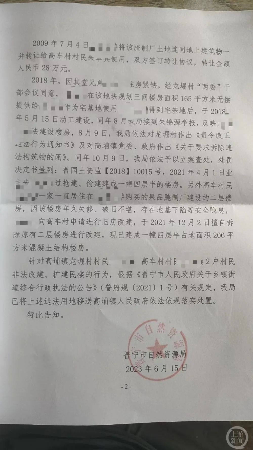 今年6月15日,普宁市自然资源局出具给朱锦源的答复告知书中写明:“2018年朱某果因住房紧缺,经龙堀村两委干部会议同意,当年5月15日在前述地块动工建设,并于2021年4月1日通过抢建、偷建建成一栋四层半楼房。另外朱某其向高车村村委会申请旧房改建后,于2021年12月2日擅自拆除原有二层楼房进行改建。”