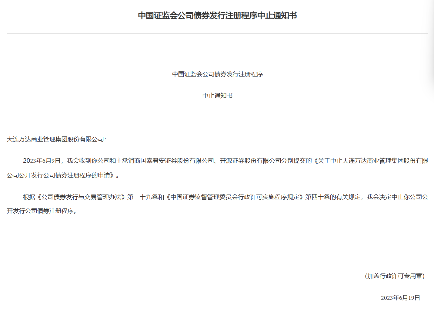 根据通知书显示,“2023年6月9日,我会收到你公司和主承销商国泰君安证券股份有限公司、开源证券股份有限公司分别提交的《关于中止大连万达商业管理集团股份有限公司公开发行公司债券注册程序的申请》。根据《公司债券发行与交易管理办法》第二十九条和《中国证券监督管理委员会行政许可实施程序规定》第四十条的有关规定,我会决定中止你公司公开发行公司债券注册程序。”