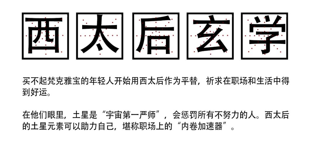 为了通过一项年终考核,Qin入手了西太后的土星项链,“听说土星是宇宙第一严师,只要你足够努力就会有好运气。有了玄学的加持,在准备汇报时心里多少就有了些底。”