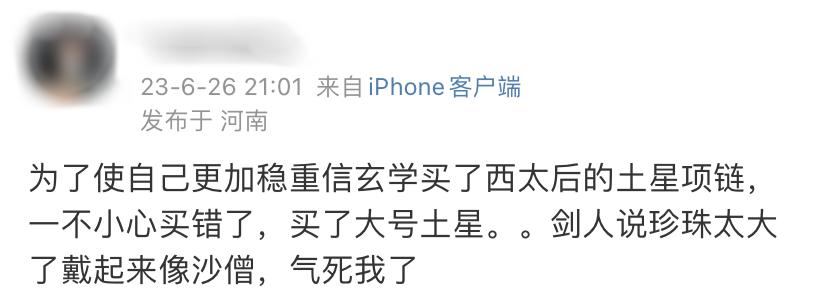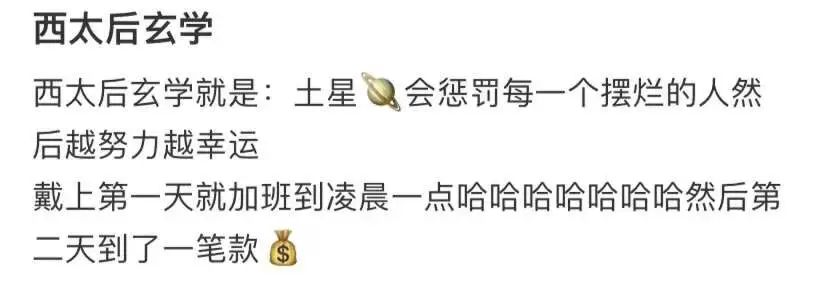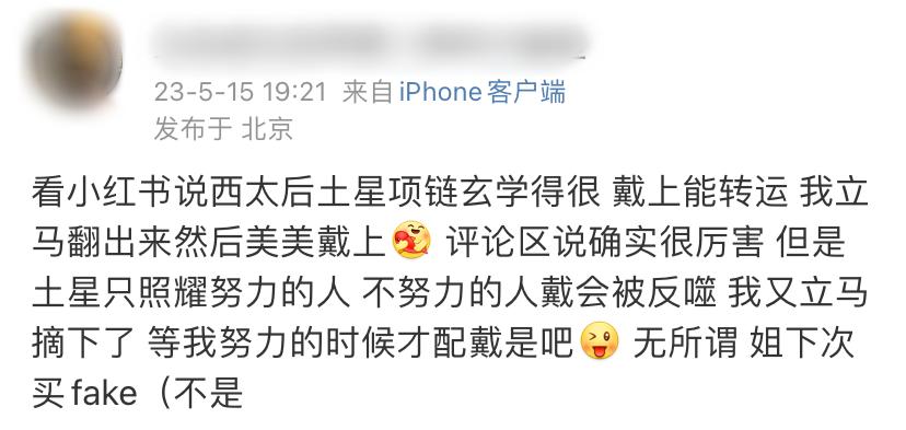 社交平台上不乏对“西太后转运说”的支持者。有人看中土星“会惩罚每个不努力的人”的严师属性,在备考时戴上西太后的土星首饰,把西太后当成了“反向玄学”逼自己努力复习通过考试;有人只在想卷时才戴上西太后作为努力的加持,躺平了就把土星项链摘下来“避免被反噬”。