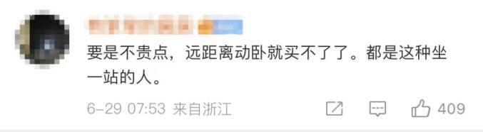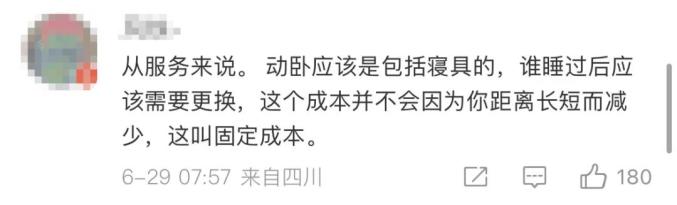 6月27日,江苏一位网友发视频并配文称,这趟动车乘坐8分钟420块钱,价格是普通二等座的70倍,高级动卧的床是镶金边了吗?另不少网友在评论区留言道:“脱下鞋子,上床盖被子,到站了”“是不是有最低的起步价?”“含不含餐食,设施怎么样?”