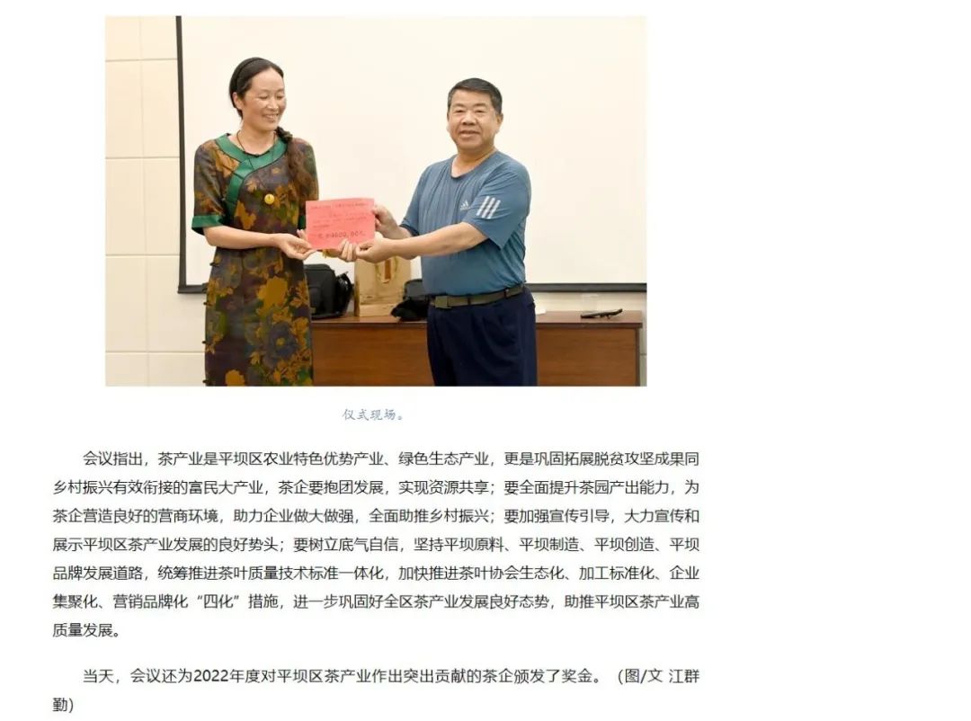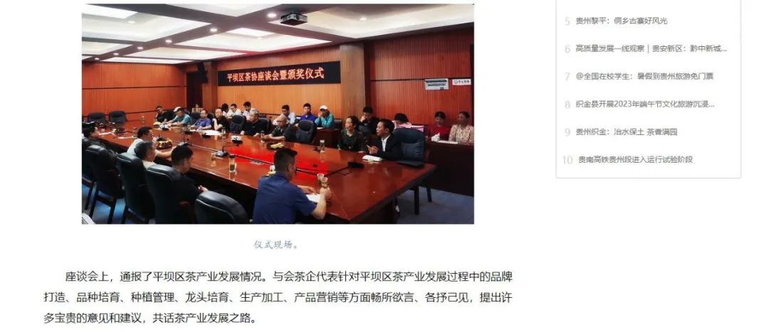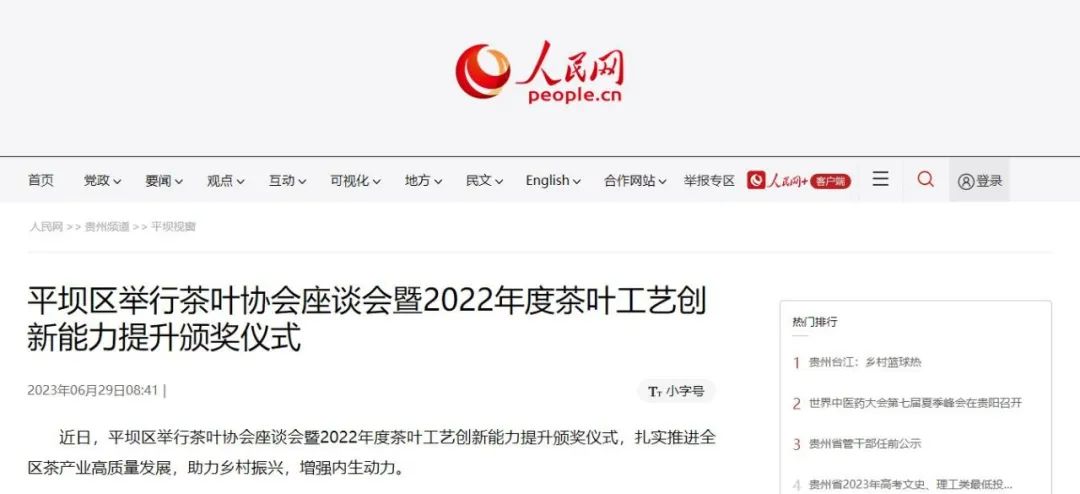 人民网贵州频道2023.6.29报道平坝区举行茶叶协会座谈会暨2022年度茶叶工艺创新能力提升颁奖仪式