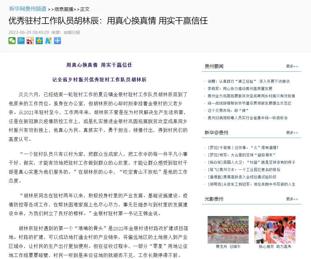 新华网贵州频道2023.6.29报道优秀驻村工作队员胡林辰:用真心换真情 用实干赢信任