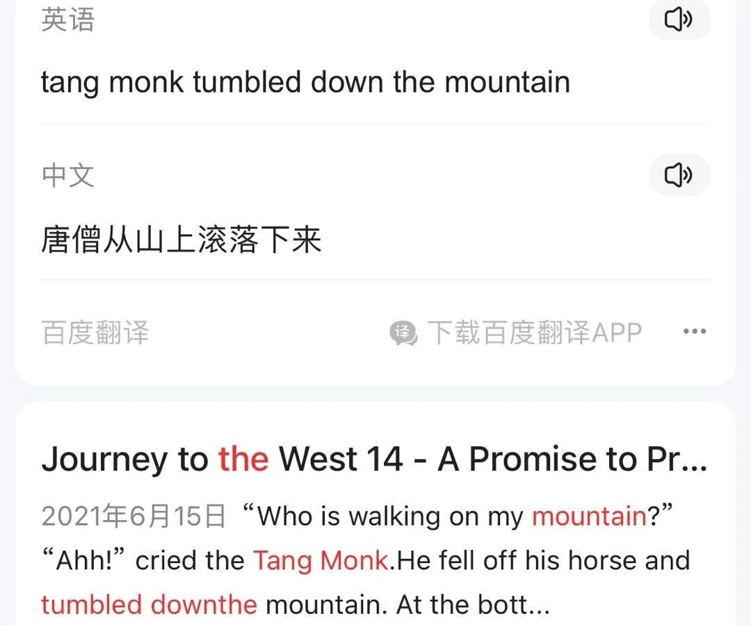 他说,这个单词的意思是滚下去,中文是唐僧从马上面掉落滚下山。然后又把英文复述了一遍:Tang monk tumbled down the mountain.