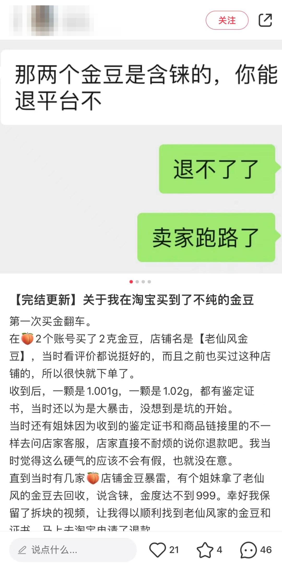 不少网友看中其接近大盘的价格,选择在批发店购买金豆。但红星资本局注意到,小红书上就曾有网友反映,在线上店买回的金豆存在表面有划痕、克重不足的情况,事后维权困难。兴业研究汇率商品高级分析师张峻滔此前接受21世纪经济报道采访时表示,金豆最大的特点就是投资门槛低,但投资者也面临成色不足、克重不足等风险,未来变现流通性更差。