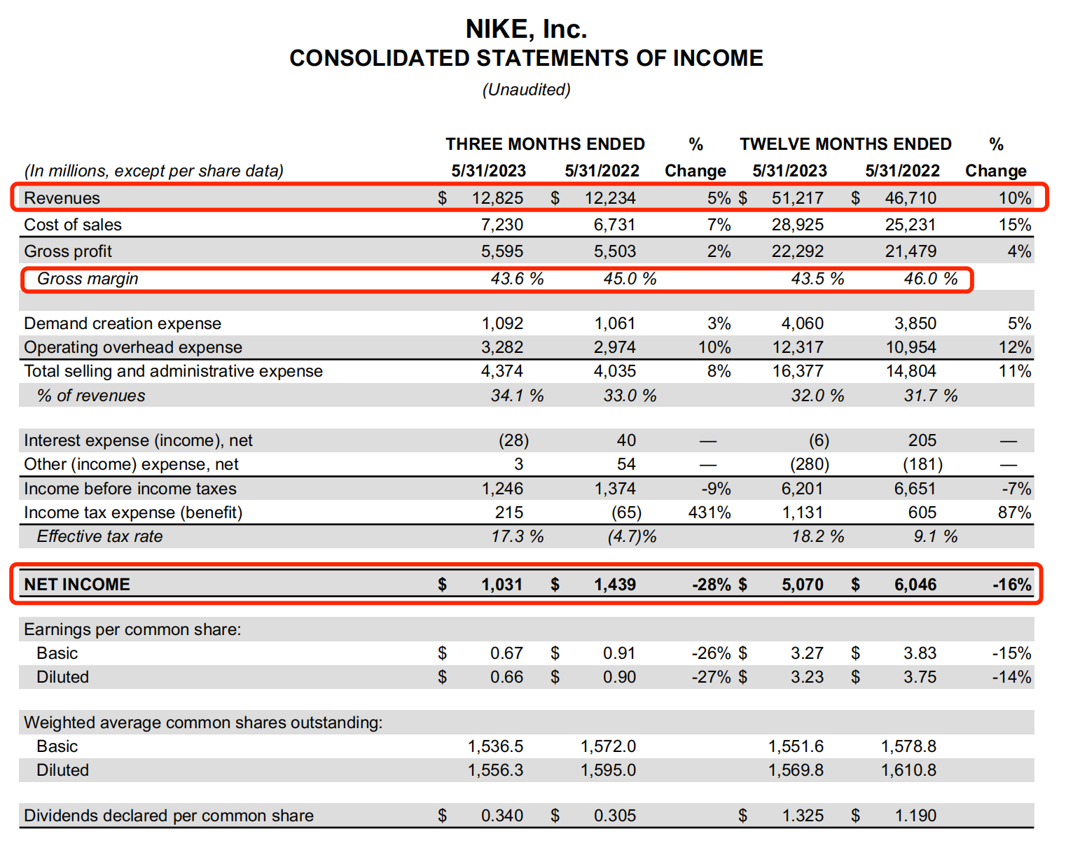 毛利率方面,耐克集团第四财季毛利率下降了1.4个百分点至43.6%,全年毛利率下降2.5个百分点至43.5%。主要是由于产品投入成本上升、货运和物流成本上升以及净外币汇率持续不利变化,部分被战略性定价行动抵消。