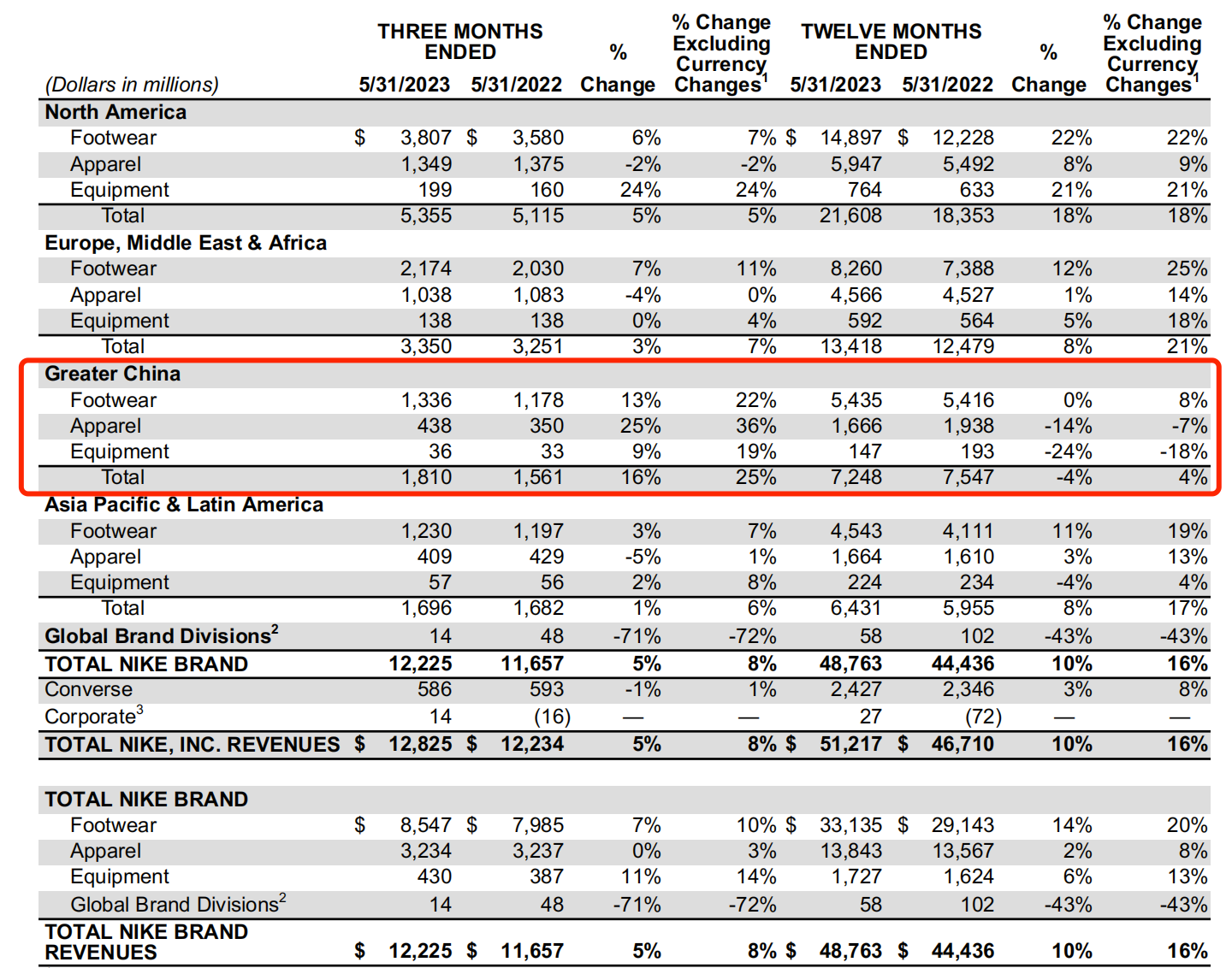 具体来看,耐克大中华区2023财年全年营收达72.48亿美元,同比下降4%,较去年同期在汇率不变基础上增长4%。其中,耐克大中华区第四财季营收取得双位数增长达18.1亿美元,高于市场预期,同比增长16%,较去年同期在汇率不变基础上增长25%。