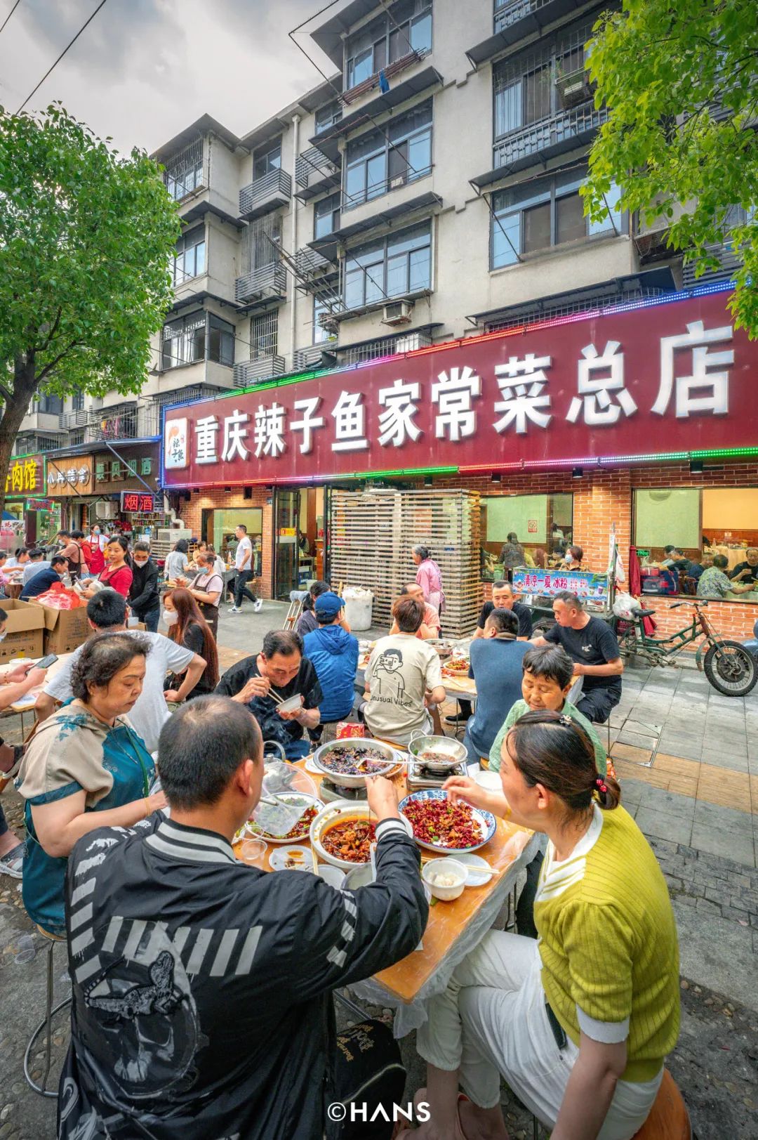 武汉人在老樟树下撸烤串,蔷薇花边吃火锅,晚上的自然风,比空调冷气惬意多了。哪家好吃?看外摆的桌椅一目了然。