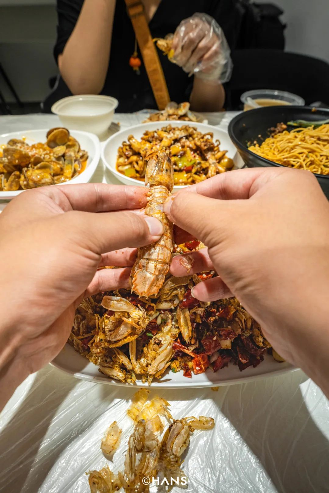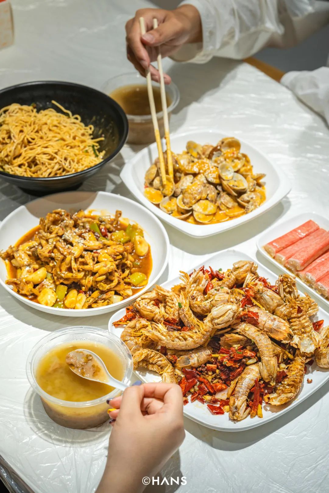滑动查看更多你要是还嫌麻烦,就上饿了么APP点个外卖,这边虾子好了,那边的煎包、奶茶也送到了。