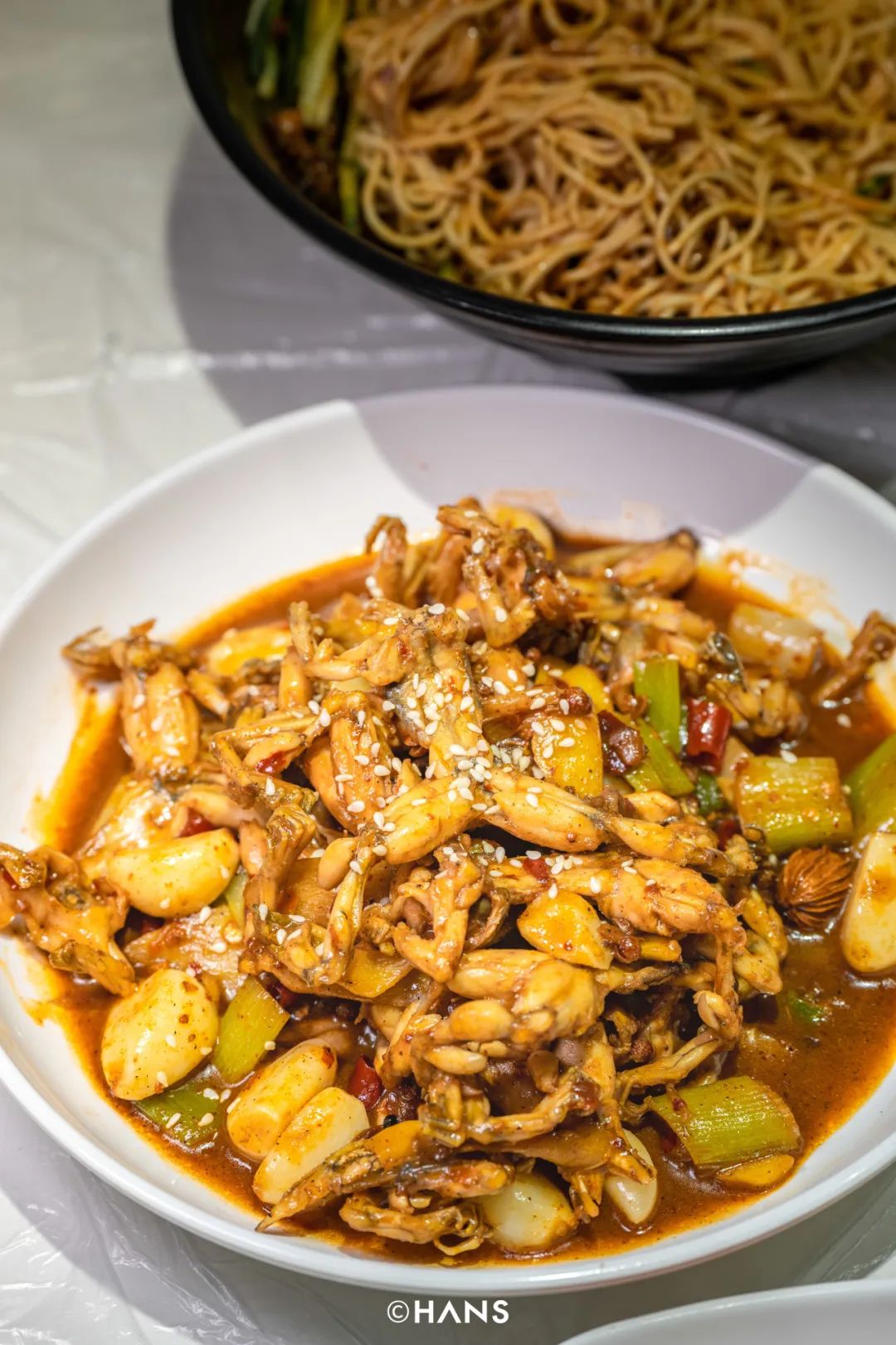 蟹钳选用的红毛蟹,壳脆好咬开,肉也饱满。店内推荐的吃法是:用剩下的汤汁拌一碗面。碱水面吸收了汤汁,香辣回甜,表面挂一层红油,爽滑。