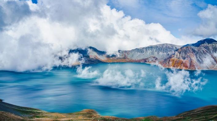 登上长白山,山顶的雪化了又落,开冰后,与天空一样蔚蓝的天池像一块晶莹剔透的镜子,静谧地镶嵌在山峰的怀抱中。