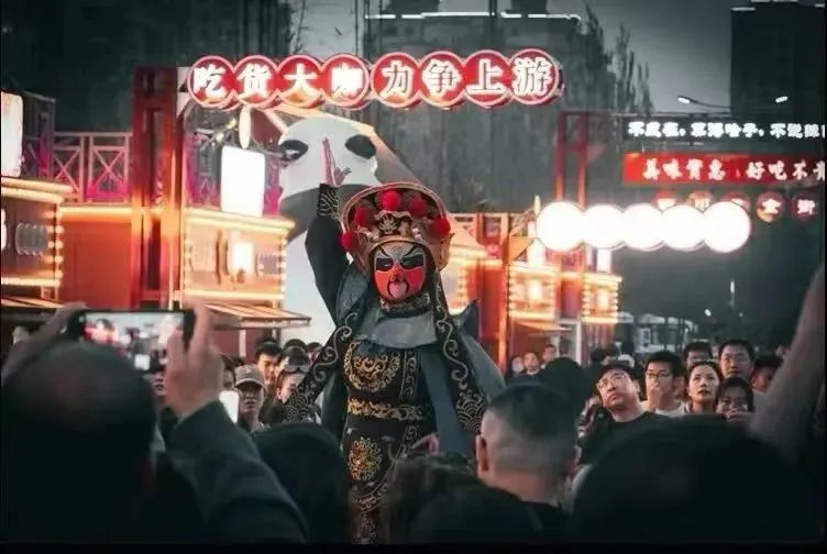 四川街上,游客围观四川变脸。演出开始,师傅穿着传统服饰,气派十足,几个动作,脸谱频换,让人不由得拍手叫好。