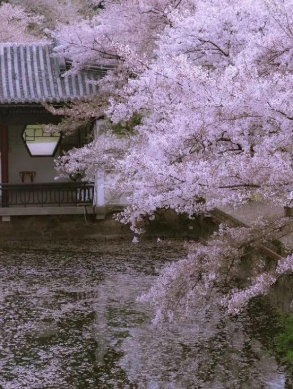 小红书@ 张力视觉偶有微风轻拂,就会有纷纷扬扬的花雨落下,飘落在宁静的湖面上,一片片粉色花瓣顺水而去,便多了几分花自飘零水自流的意韵。