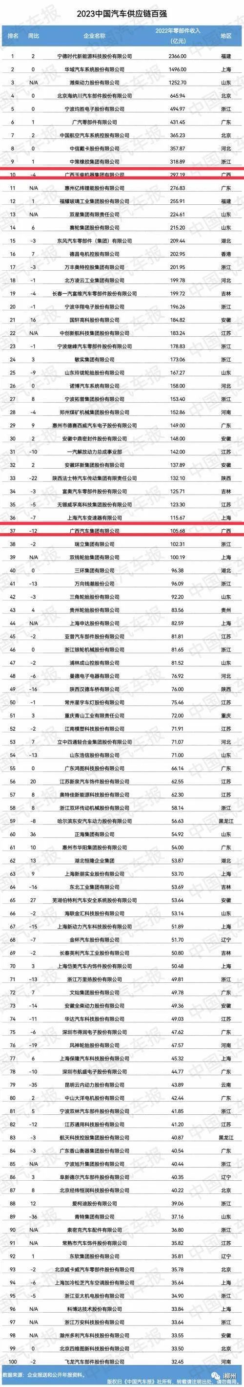 中国汽车零部件企业百强榜显示,广西有2家企业上榜,分别为广西玉柴机器集团有限公司和广西汽车集团。