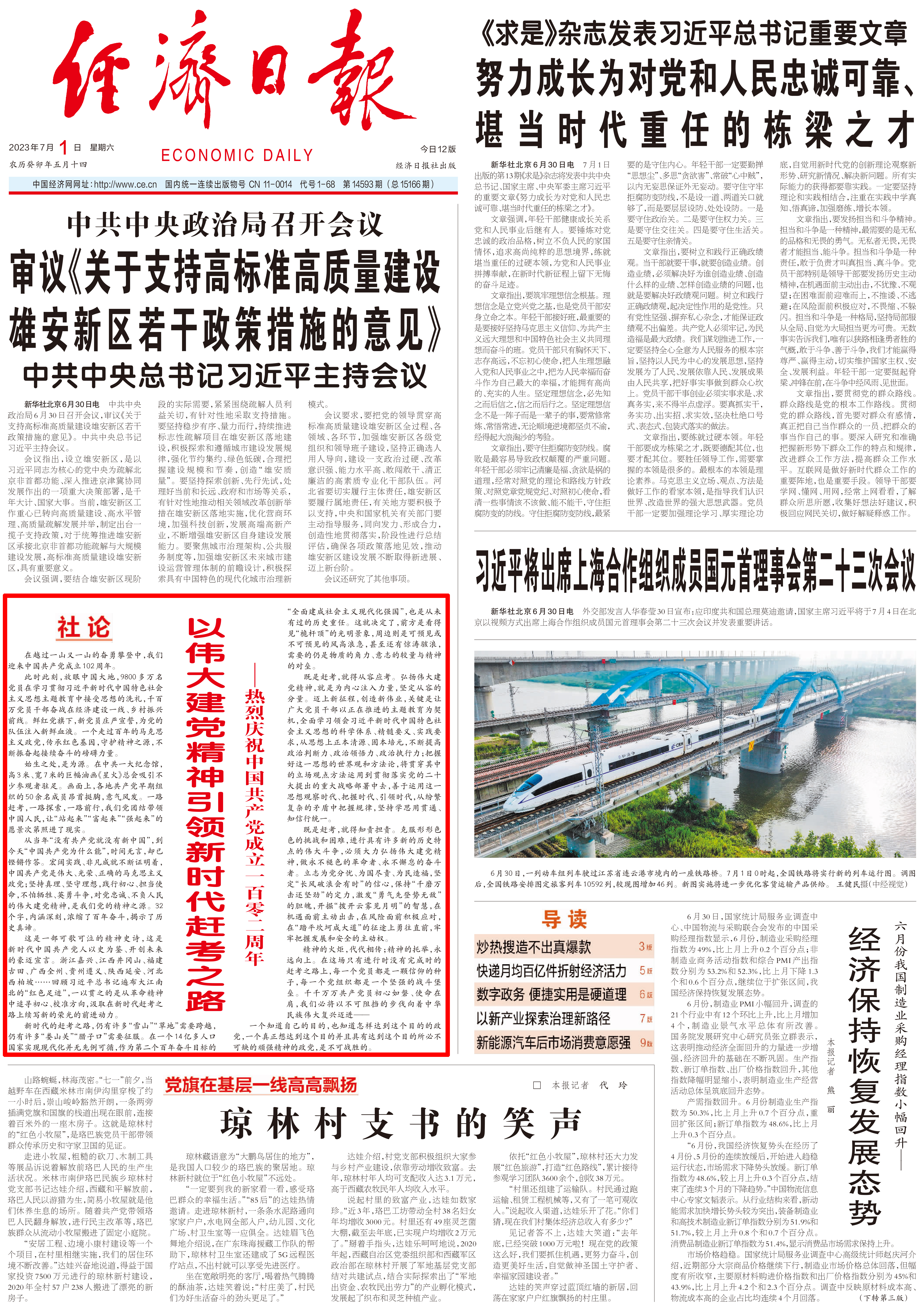 经济日报头版社论:以伟大建党精神引领新时代赶考之路