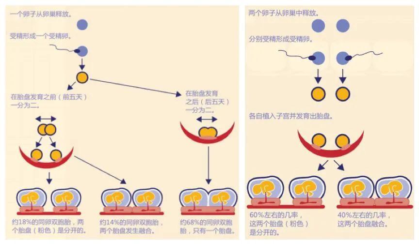 左图,同卵双胞胎的发育过程示意图。右图,异卵双胞胎的发育过程示意图。胚胎外面两层膜,羊膜在内,绒毛膜在外。一般来说,只有同卵双胞胎才会既共用胎盘又共用绒毛膜 | 重庆市妇幼保健院然后开始做各种检查。这才发现,居然是极其少见的“半同卵双胞胎”。