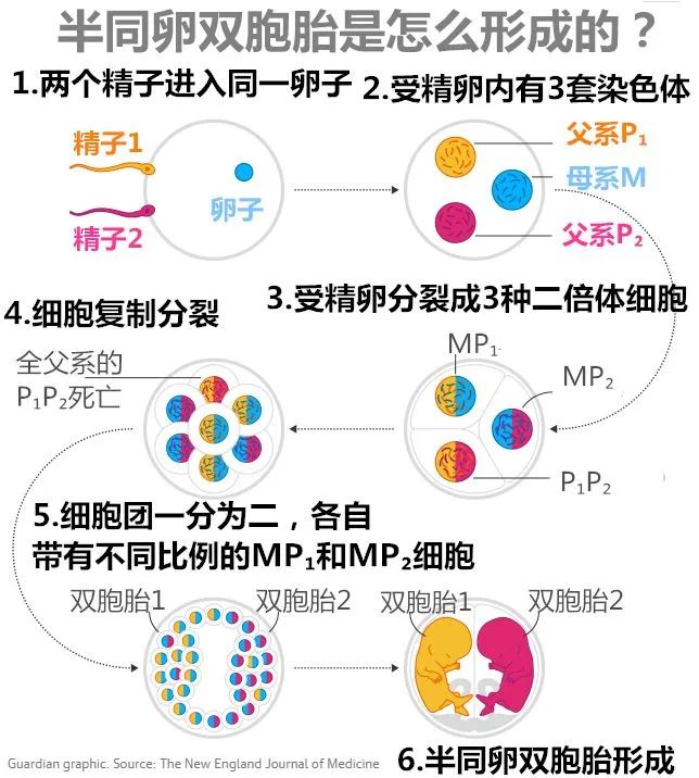 根据研究推测所绘的发育过程 | 原图来自《卫报》,由作者汉化最后两个胚胎都是嵌合体。基因测序比对后发现,他们继承的母亲基因100%完全相同,父亲基因77.7%完全相同。