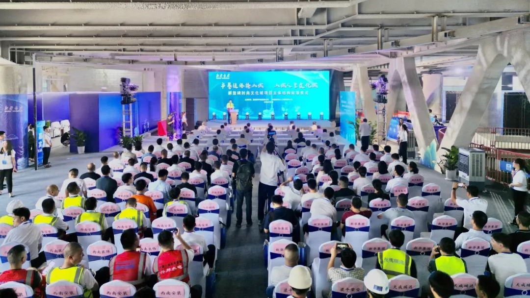 7月1日,由中建八局承建的重庆市渝中区解放碑新地标时尚文化城项目举行主体结构封顶仪式,标志着项目建设即将全面进入机电幕墙安装和装饰装修施工阶段。渝中区委书记、区长黄茂军,渝中区委常委、副区长邓光怀,渝中区副区长艾正兵,重庆新华书店集团公司党委书记、董事长肖陵,中建八局副总经理苗良田出席封顶仪式。