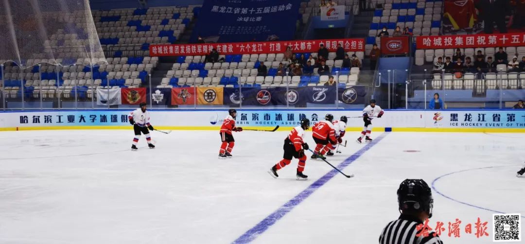 2021年完成改扩建工程后,位于八区体育运动中心的哈尔滨冰球馆焕然一新。目前,这里共有3座单体建筑场馆,总面积约3.2万平方米,拥有4块1800平方米国际标准冰场,均达到KHL(大陆冰球联赛)和NHL(国家冰球联盟)对抗比赛标准,是哈尔滨市最大的冬季项目全民健身及竞技体育室内训练比赛基地。